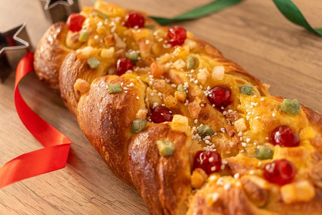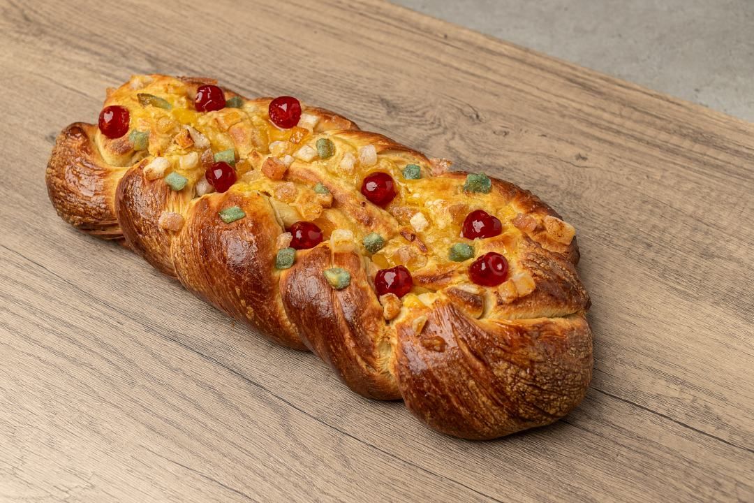 Sweet brioche dough braid with doce de ovos, candied fruits and nuts.