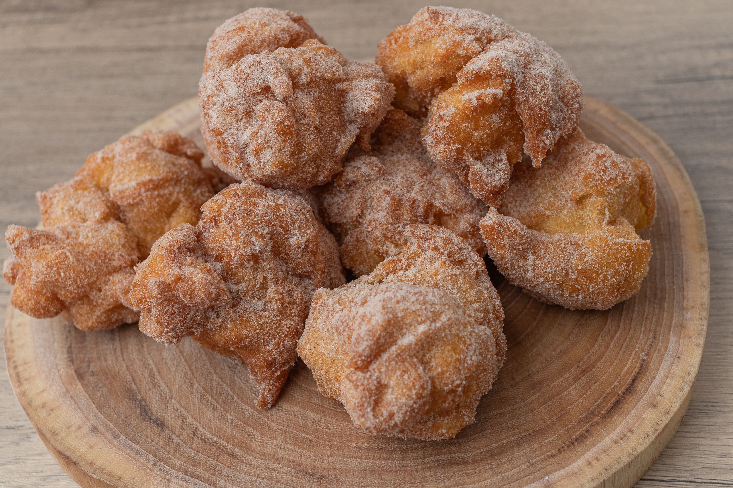 Portuguese Christmas churros, fluffy balls of fried dough, sprinkled with sugar and cinnamon.