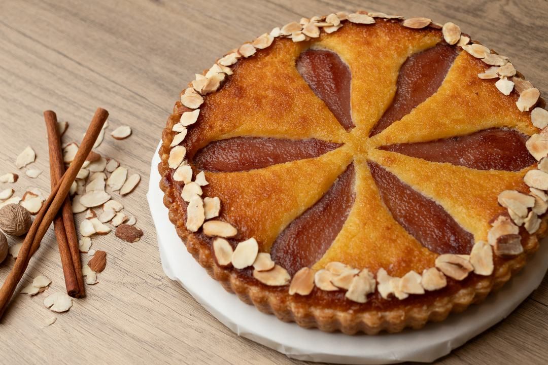 Frangipane tart with spice Port wine poached pears served with spiced Port wine sauce.