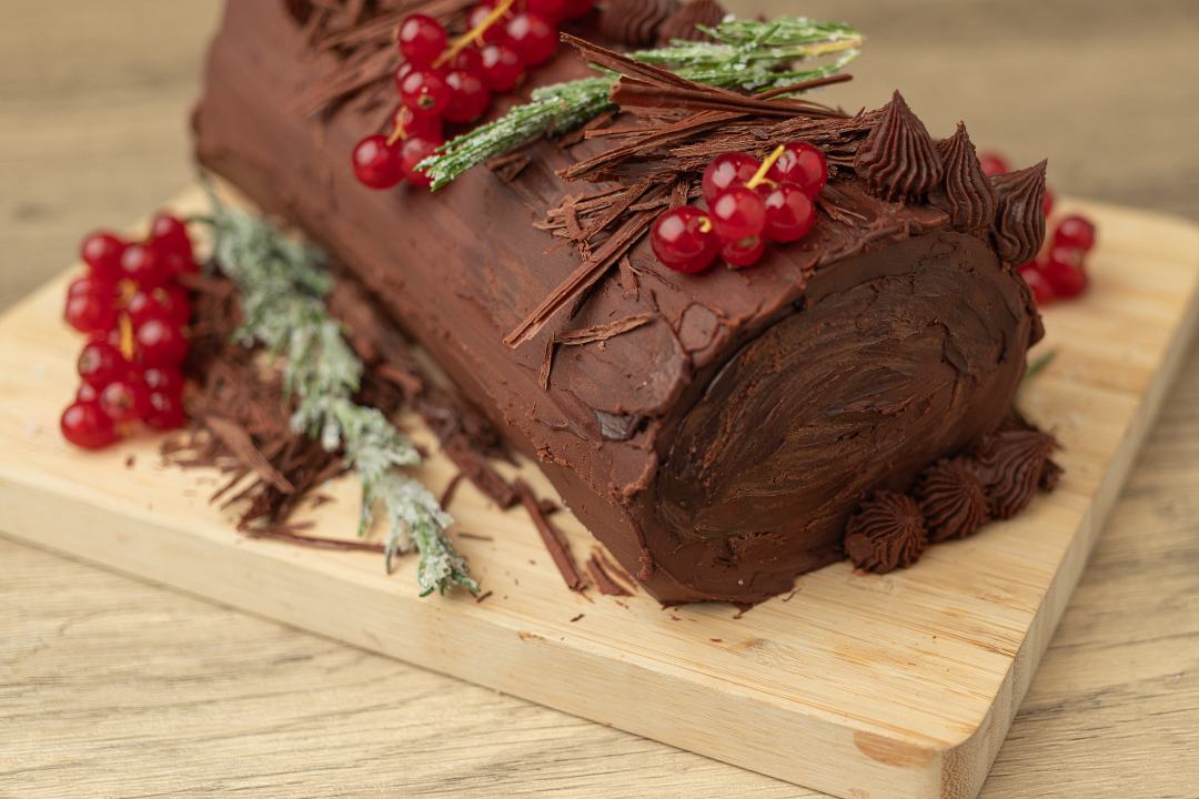 Christmas Yule Log. Chocolate sponge rolled with vanilla chantilly cream, covered in chocolate swiss meringue buttercream, dark chocolate ganache, chocolate shavings and cranberries.